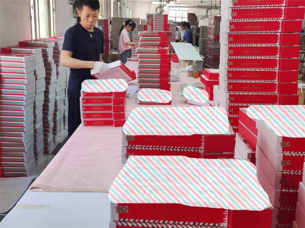 We mainly do the preparatory work on the first floor and make handmade boxes on the second floor. This is our main feature – handmade boxes. We have more than 100 employees, most of whom have been working in our factory for more than 10 years. They are very good at making boxes. So you can trust our quality. Let’s take a look at our production line. First row, they are gluing grey cardboard. By doing this, they can turn the cardboard into the basic shape of the box. Look? This flat cardboard is glued into a box shape.